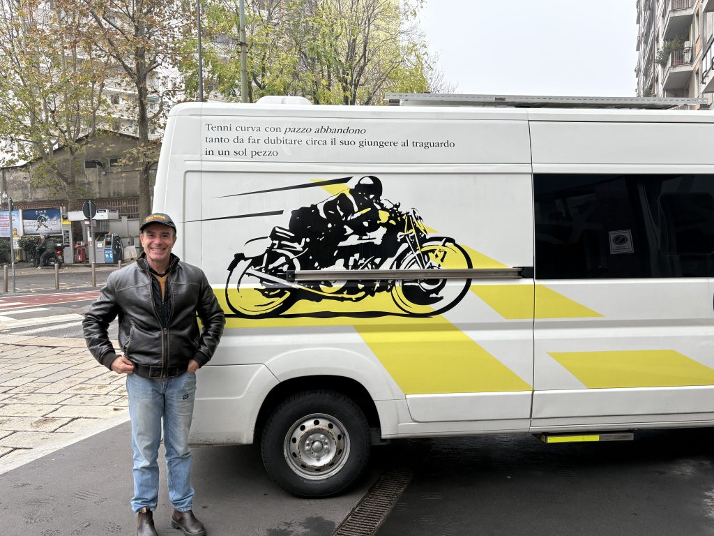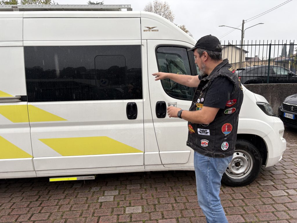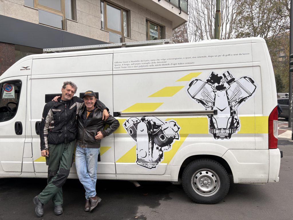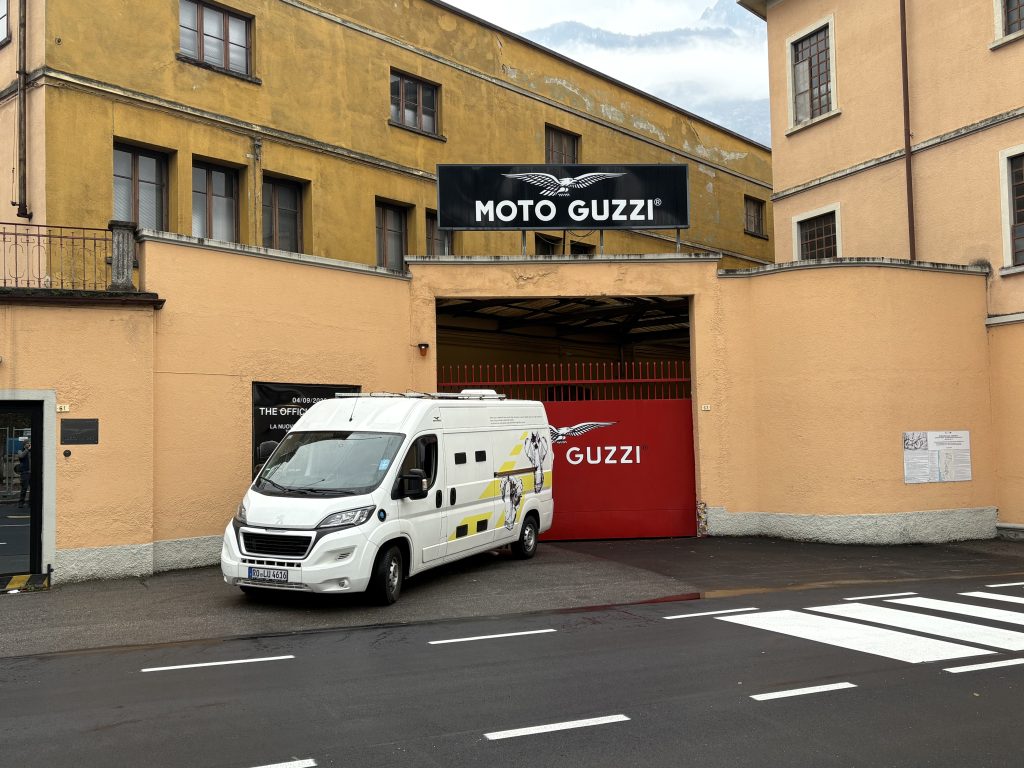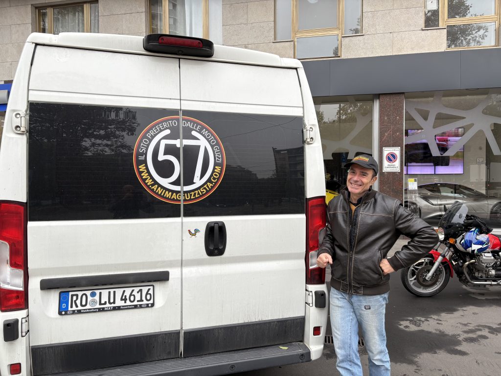 E’ cosa nota quanto i tedeschi amino l’Italia, per le vacanze. Se poi sono anche guzzisti, i freddi teutonici visitano il Lario con una certa frequenza. Ed e’ proprio da questo dato di fatto, che nasce questa storia. Durante una fresca serata di Novembre, uno strano furgone bianco si avvicina a Mandello, e si ferma per la notte al parcheggio del cimitero. Il furgone ha delle decorazioni strane, che richiamano dei motori a V e un tizio in piega, ci sono anche delle scritte che sembrano addirittura poesie. Alla guida, un pelato con losche intenzioni: dopo la delusione delle non-novita’ di EICMA 2025, ha deciso di andare personalmente a Mandello a prendersi la nuova guzzi sportiva diretta