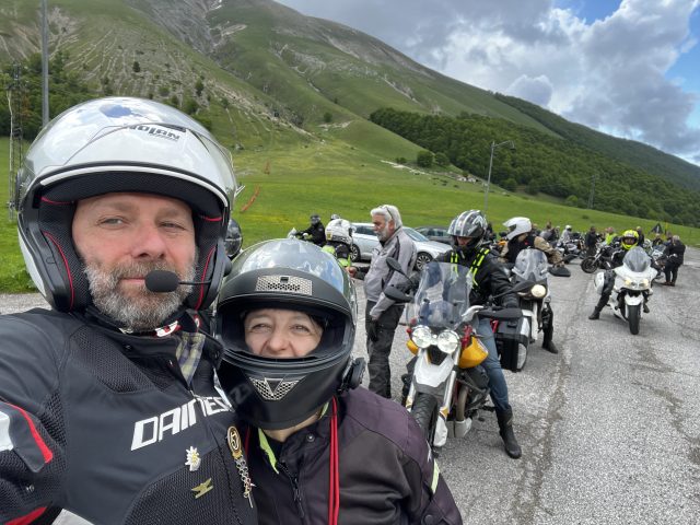 Poi, per lavoro, conosco una ragazza e suo marito, oggi miei carissimi amici: Francesca e Goffredo, Guzzisti DOC! Grazie a loro conosco Anima Guzzista. Partecipo ad un primo UinterParty e mi diverto un mondo, sentendoli cantare “Parole Parole Parole” oppure “Rumore”, e incontro Vladimiro, Er Tatuato… wow che mondo allegro! Bello! Peccato non avere una moto, e soprattutto la mia patente non va bene per le moto… Ma ecco che incontro un altro motociclista, lo conosco, mi innamoro e diventa il mio compagno: Rolando. Guarda guarda: anche lui è un motociclista! Anche lui è figlio di un Guzzista! Gli presento Francesca, Goffredo e Anima Guzzista, e, come me, si innamora di questo mondo. Tutto perfetto… se non che… ecco… Rolando guida una Honda. Opsssss! Per fortuna Anima Guzzista è inclusiva e ci accoglie a braccia aperte. Perché entrambi abbiamo la Guzzi tatuata sul cuore.