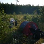 Pianto la tenda in una radura meravigliosa, accendo il fuoco e poi giusto il il tempo di mangiarmi un panino e le luce si ritira sulla linea dell’orizzonte lasciandomi all’imbrunire seduto su una pietra a finire l’ultimo frutto. Rimango imbambolato a guardare il fuoco che scoppietta, ricordo con piacere i bivacchi con gli amici che facevo da ragazzino, li rivedo nei bagliori e nelle ombre del fuoco, immagino le loro voci e provo una serena malinconia. La libertà di viaggiare da soli chiede in cambio un tributo alla solitudine, lo pago, entro in tenda, poi nel sacco a pelo e mi corico dopo una piccola veglia alle stelle di 5 minuti, estasiato dalla “calotta” di cielo nero come la pece con le sue mille lentiggini bianche spruzzate nel cielo.