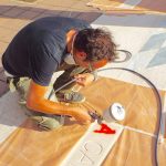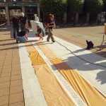 Non restano ancora molte ore di luce e si procede per la colorazione delle scritte a terra dove, dopo aver protetto intorno con della carta, il Ticcio procederà alla stesura del colore.