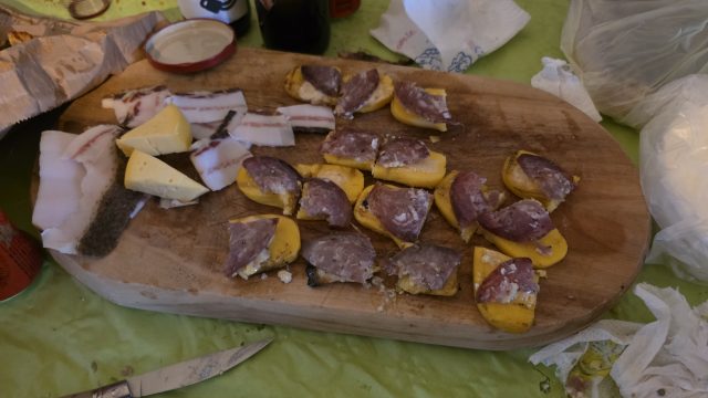 Il luogo non ha la corrente elettrica. C’è solo un caminetto con abbondante scorta di legna e questo è già un buon presupposto per una Porcheria tosta e spartana come sempre. Aggiungo che il costruttore del caminetto non vincerà mai il Nobel in materia in quanto il fumo dentro la stanza si poteva tagliare a fette, un po’ come il salame che era in tavola e a niente sarebbe servito aprire una finestra e chiuderne un’altra nel vano tentativo di aumentare il tiraggio. Si respirava solo fumo!